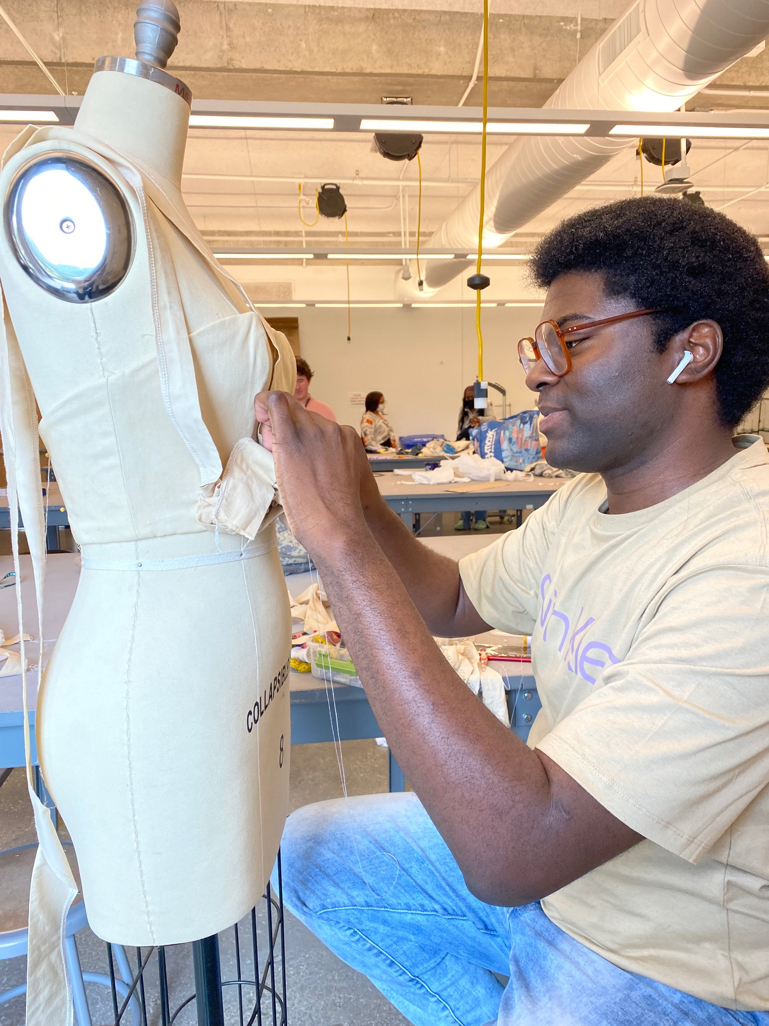 Summer 2022 Fashion Design Studio course, ADES 4590, assisted fashion design students in developing additional competence in design research — with a sustainability focus. The course was part of a collaboration with faculty from the programs of Interior Design, Fashion Design and User-Interaction Design, funded as part of a grant by Cotton Incorporated. The project the fashion design students participated in, titled "The Swap," involved collecting community information, outreach, and learning sustainable development methodologies. The course included time to explore sustainability and its relationship to healthy communities, create by applying their key learnings into team-led prototypes and disseminate their findings through visual representations common to industry practices in the design field. The class heard from guest speakers about research methods and sustainable methods and approaches. Students also focused on community mapping, color theory, field observations in the Denton area, and teamwork and they participated in an arts-based workshop at the Greater Denton Arts Council. Through these experiences, the students were trained in the use of ethnographic methods to assist them as they created personas and user-journeys based on their community research. As a result of their efforts, the fashion design students generated a series of garments, which incorporated sustainable development methodologies with natural fibers, natural dyes, and up-cycling to produce a capsule collection intended for exhibition with the public as part of their outreach campaign to raise awareness of the importance of recycling.